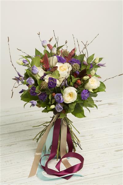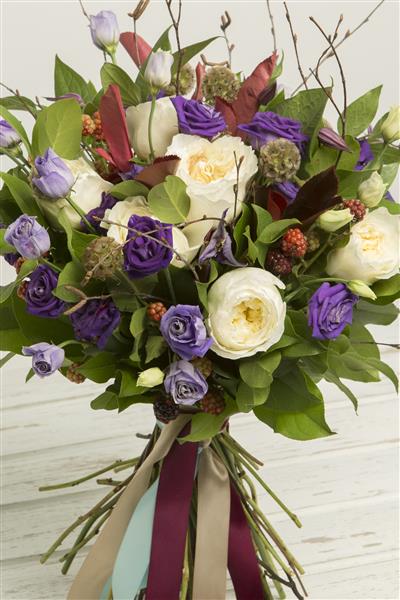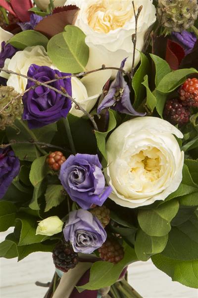 A wild composition of purple lisanthus, scented cream garden roses interspersed with autumn foliage and twigs.
