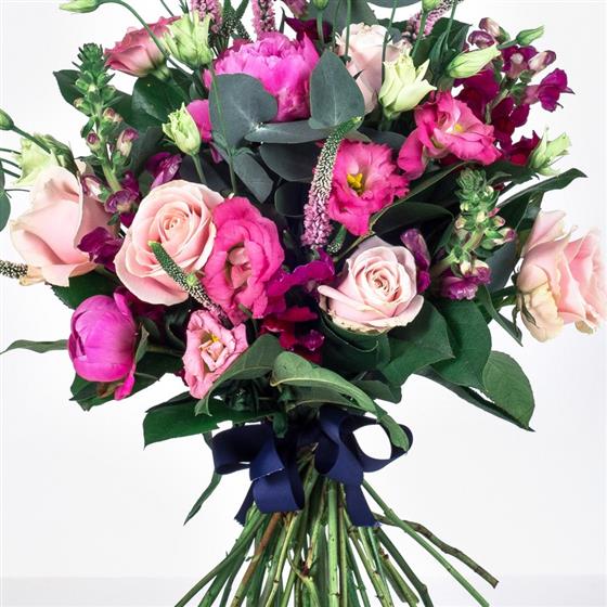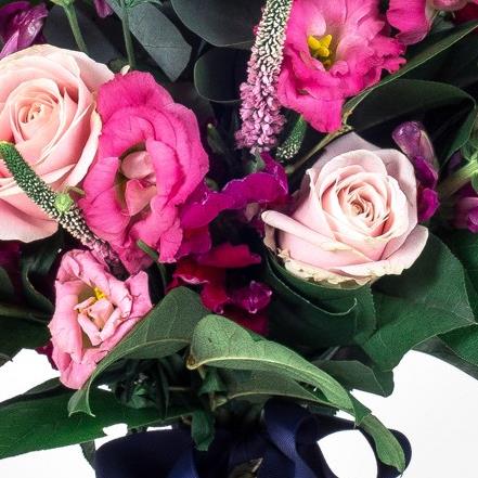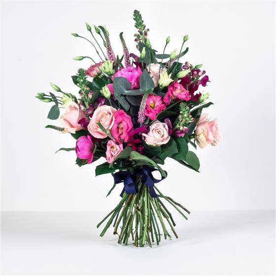 A lovely mix of seasonal pink flowers including roses, lisianthus and antirrhinums.