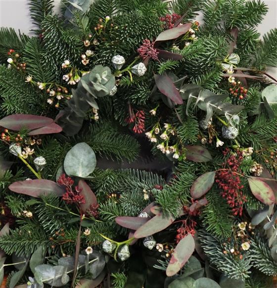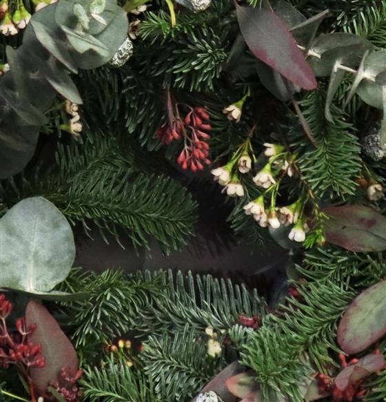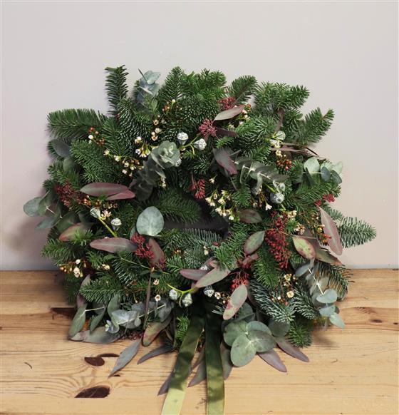 A simple wreath available to add your own decoration or flowers.. It is made from fresh blue bruce and eucalyptus. sizes, 14" , 16" and 18"