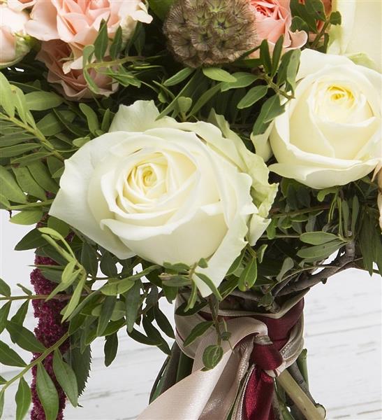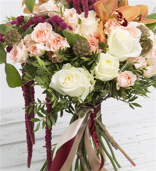 A Lavish combination of roses, spray roses and cymbidium orchids finished of with ruby amaranthus. Picture shows standard size