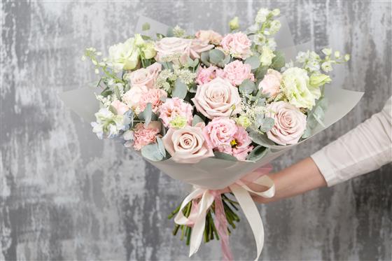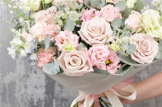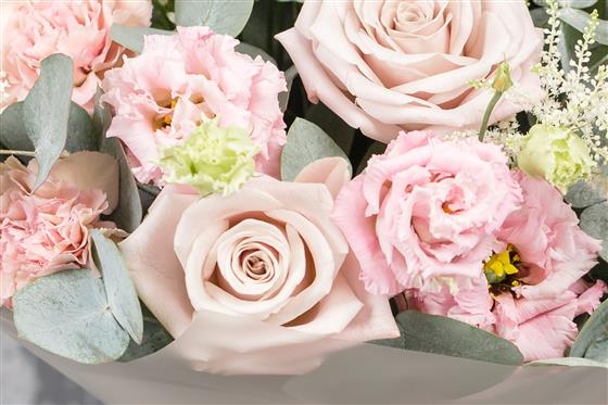 A lighter design of Pale pinks roses and cream lisianthus mixed with eucalyptus. Great for all occasions. Picture shows standard size.