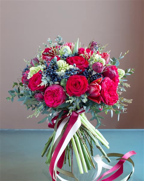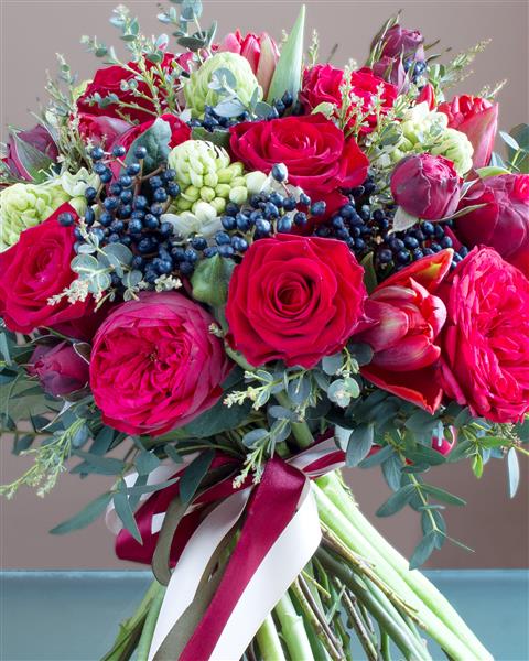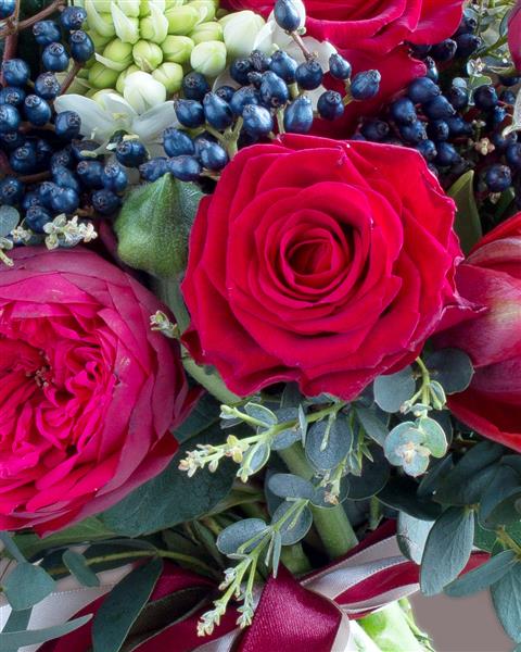 A Lavish combination of dark red roses and burgundy tulips finished off with eucalyptus. Picture show standard size.