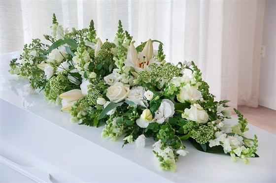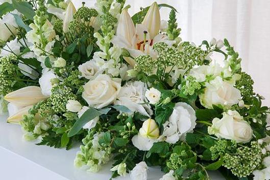 The selection of stunning flowers in snow white shades gives grace and simplicity to this casket spray. The design features Oriental Lily, sweetly scented freesia, large-headed roses, lisianthus and antirrhinum , arranged with ruscus