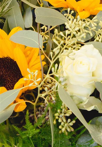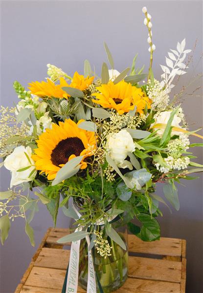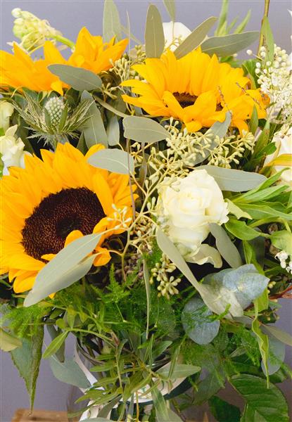 Yellow, whites and creams including sunflowers. Sure to lift up a friend. Vase not included