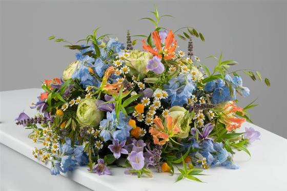 A classic selection in vibrant shades including large-headed roses, freesias, delphiniums, daisies and gloriosa presented in a posy design.