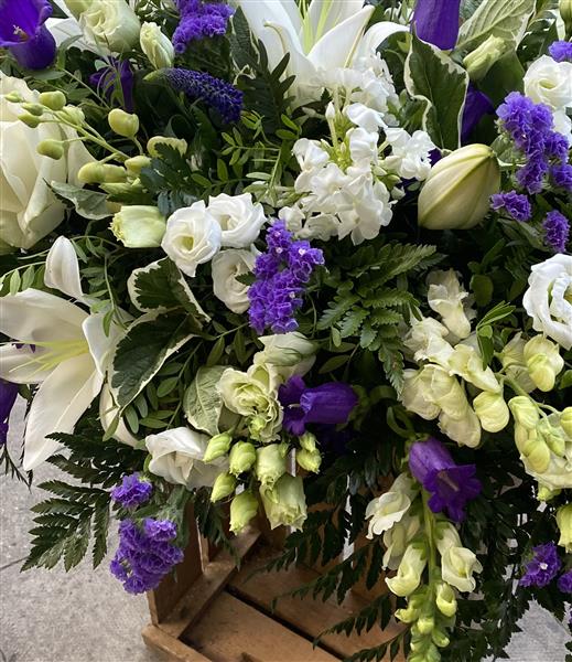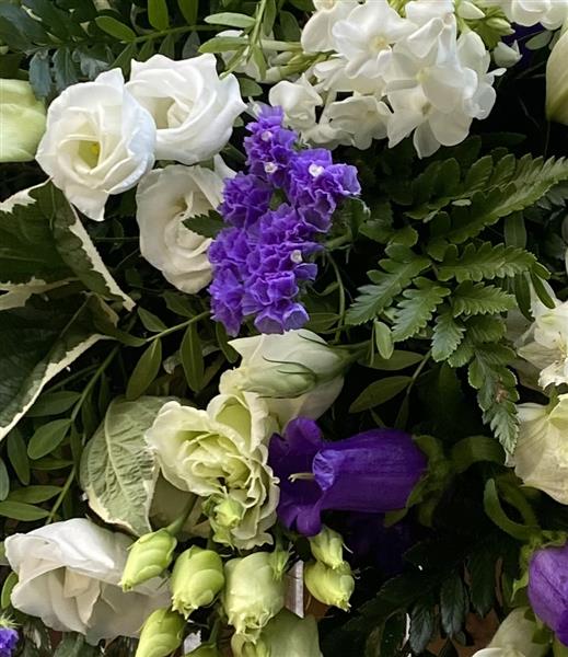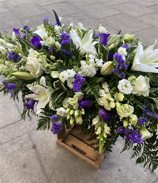 A lovely combination of white and purple flowers in lilies, roses and lisianthus.