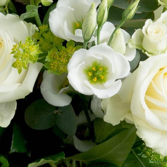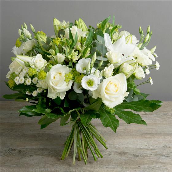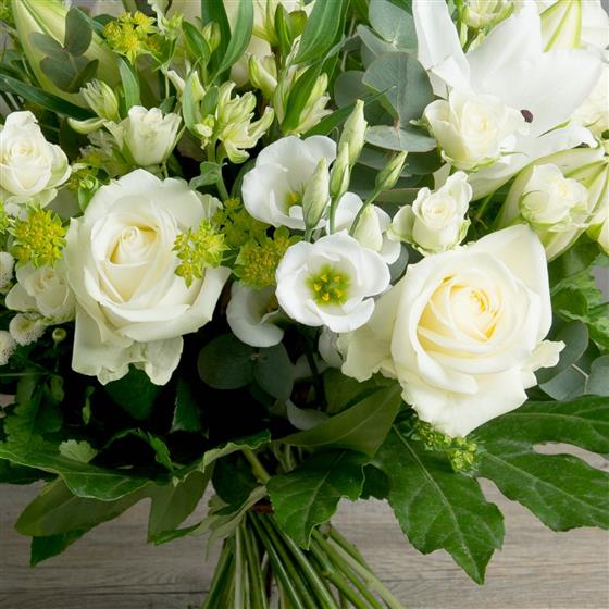 White oriental lilies and White avalanche roses interspersed with white alstromeria and eucalyptus